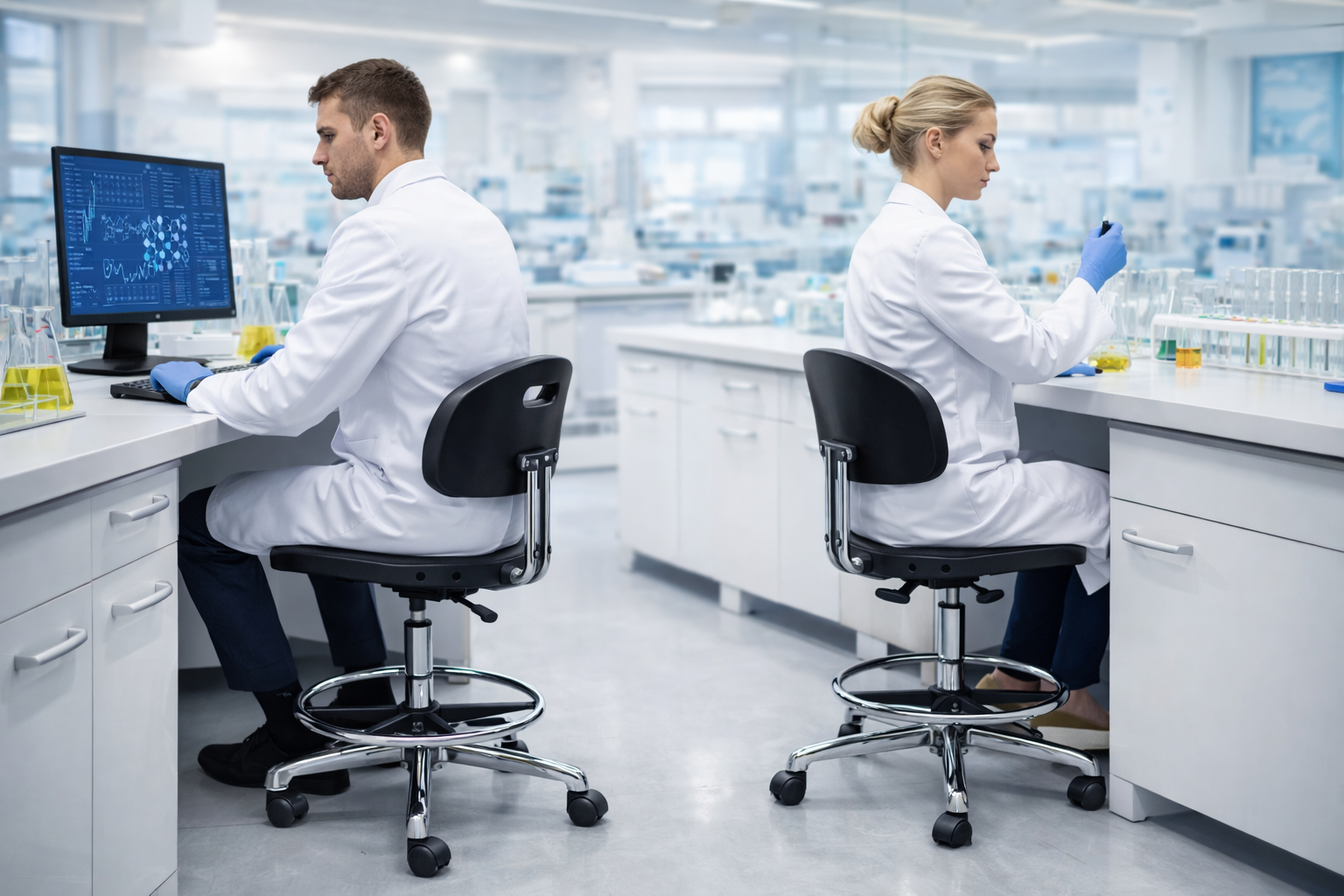 Laboratory technicians frequently move between workstations. A stable chrome foot ring provides leg support at higher seating levels, while smooth casters ensure effortless movement. The balance between mobility and firmness prevents tipping and enhances efficiency.